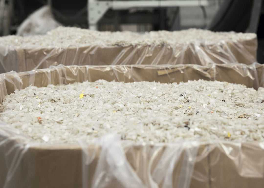 First, containers arrive at our recycling plant bundled in large bales. The flattened containers are sent up a conveyor to a giant shredder to be pre-shredded.
