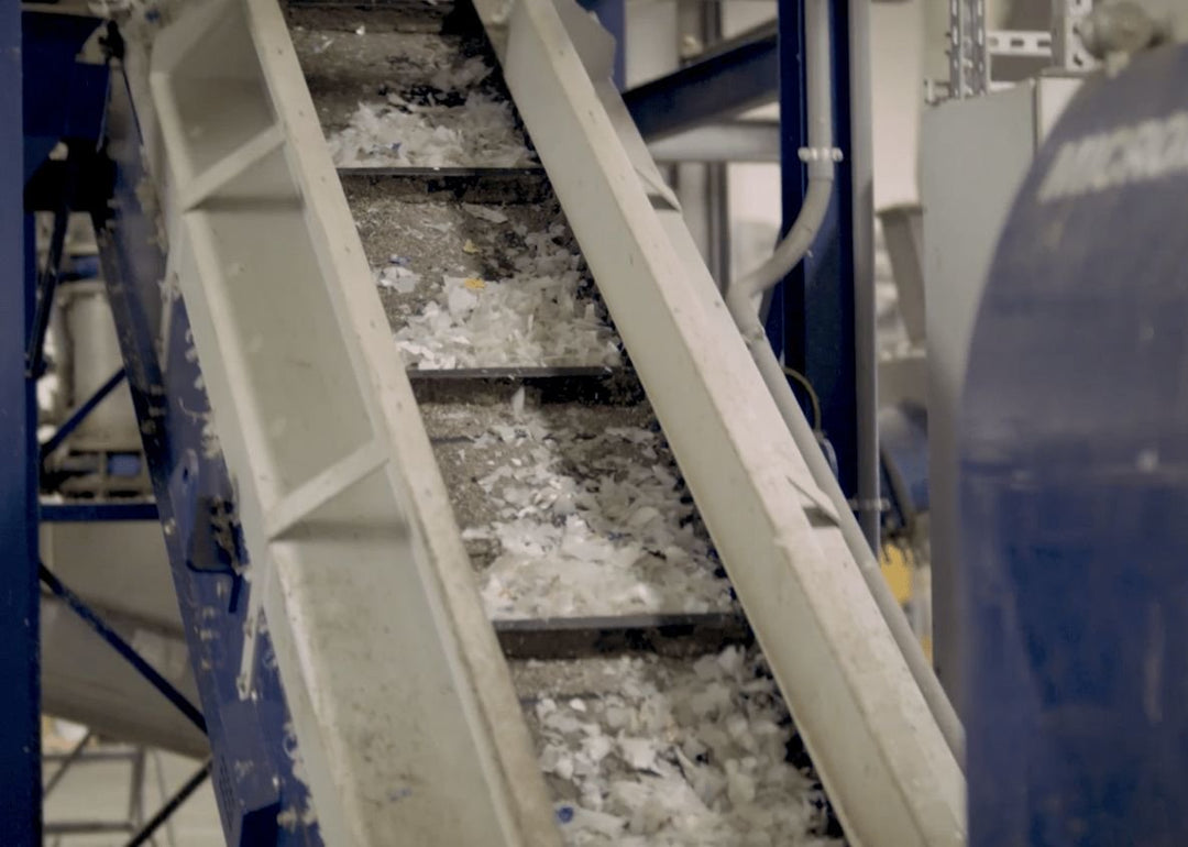 The cleaned and sorted material is then finely ground into a 1/2” flake and sent to a float tank where any other non-plastic items will sink out of the mix. The flakes are then dried and air separated.